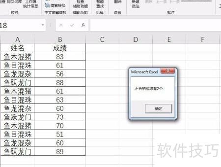 6、 统计B2至B13区域中低于60分的成绩数量,并给出提示信息,效果所示。