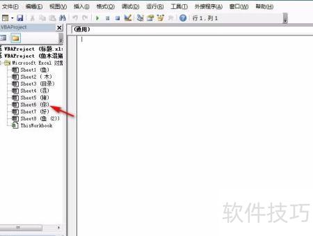 2、 按下Alt+F11键进入VBA编辑器,选择左侧目标工作表,右侧即显示空白代码编辑区域,具体界面所示。