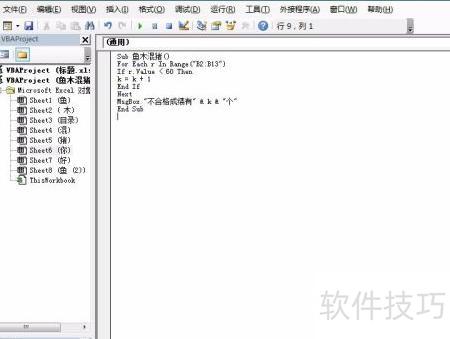 13、 统计并提示数据区域中不及格成绩的数量。