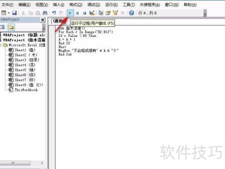 7、 将光标置于代码中部,点击运行子程序按钮,操作所示。