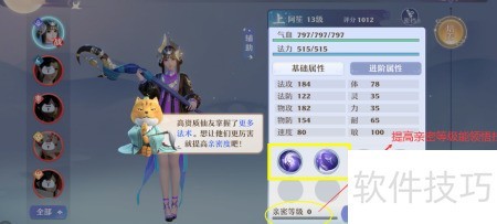 4、 仙友属性界面左下角显示亲密等级,提升等级可解锁新技能。