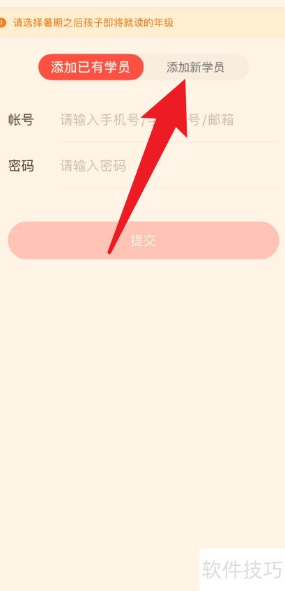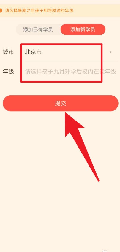 5、 选择新学员所在城市与年级,确认后点击提交即可完成操作。