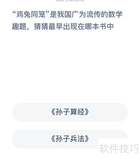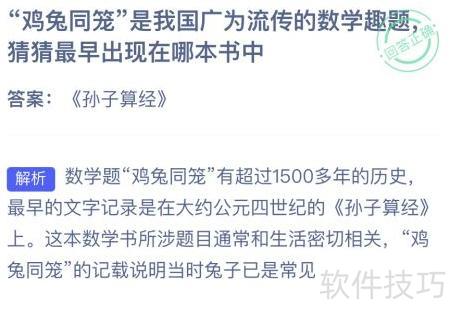 1、 鸡兔同笼是我国著名的古典数学趣题,你知道它最早出自哪部古籍吗?