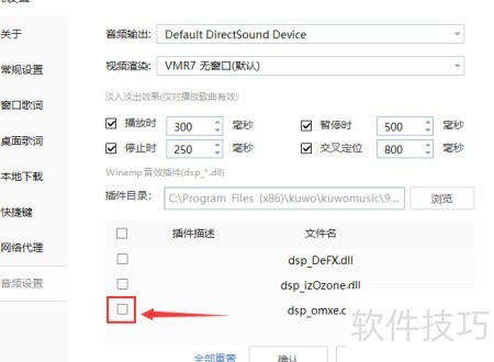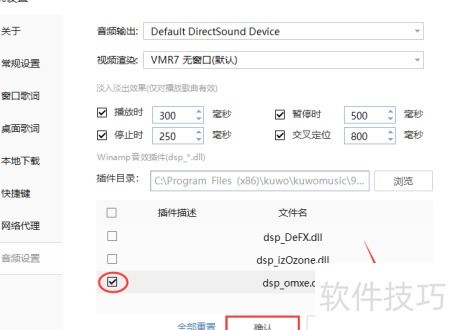5、 进入音频设置界面,在Winamp音效插件(dsp_dll)下方,勾选dsp_omxe.dll左侧的复选框即可,具体操作所示。