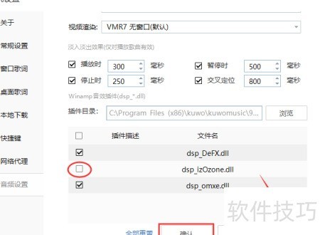 5、 进入音频设置界面,在Winamp音效插件(dsp_dll)列表中,找到dsp_izOzone.dll,点击其左侧方框,取消勾选即可。具体操作可参考附图所示步骤。