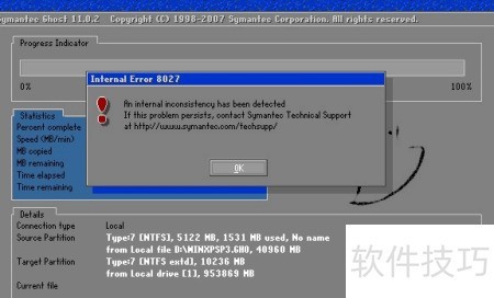 1、 检测到一个内部不一致性错误通常在复制镜像文件.GHO接近完成时出现,意味着系统重装过程中发生了异常,导致安装失败。该问题并不频繁发生,但一旦出现,即表示当前操作未能顺利完成。此时系统可能提示用户将错误日志输出至指定路径,例如A:/GHOSTEER.TXT,用于记录具体的故障信息。此类错误可能与镜像文件损坏、存储介质不稳定或硬件兼容性有关。虽然大多数情况下重启并重新尝试可解决问题,但如果反复出现,则建议检查源文件的完整性、U盘或硬盘的状态,以及设备运行环境是否正常。若无法自行解决,应尽快联系技术支持部门以获得专业帮助,避免影响系统恢复进程。