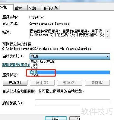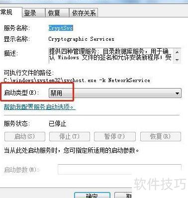 在Win7系统中,通过运行services.msc找到Cryptographic Services,右键选择属性,将其启动类型设为禁用即可。