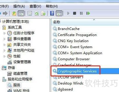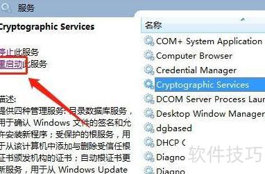 在Win7系统中,通过服务管理器找到Cryptographic Services,右键选择重启即可。