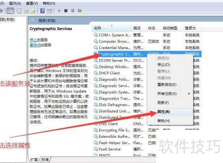 4、 此时,若需将Cryptographic Services服务更改为手动启动类型,可右键点击该服务,在弹出的菜单中选择属性,进入Cryptographic Services 服务属性(本地计算机)设置界面,随后在启动类型选项中进行相应调整即可完成配置。