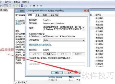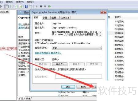6、 此时,点击Cryptographic Services服务属性窗口下方的应用按钮,完成设置后,再点击确定按钮即可保存更改。
