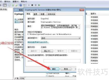 7、 要将Cryptographic Services服务设置为自动启动,首先依次完成前五个操作步骤。在第五步中,从下拉选项中选择自动模式,随后继续执行第六步操作。完成上述流程后,即可成功配置该服务的启动类型为自动,确保其在系统启动时自动运行,整个设置过程简便快捷,适用于需要依赖此服务正常工作的应用场景。