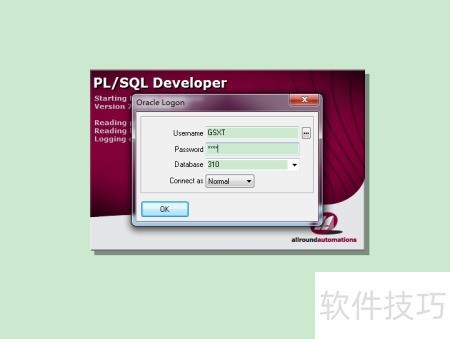 8、 双击启动PLSQL,进入登录界面后,填写数据库用户名和密码,数据库名称处输入此前在记事本中配置的简称(例如310),连接模式选择Normal,确认无误后点击OK按钮完成登录操作。