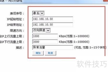 8、 点击新增按钮,弹出窗口后输入需限制的IP地址和网速,确认无误后点击增加,即可对产生异常流量的设备进行限速,保障整体网络稳定运行。