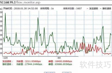5、 点击流量监视将弹出独立窗口,实时显示局域网对外流量。若曲线变为水平直线(已达峰值),表示网关资源耗尽,网络已处于瘫痪状态。