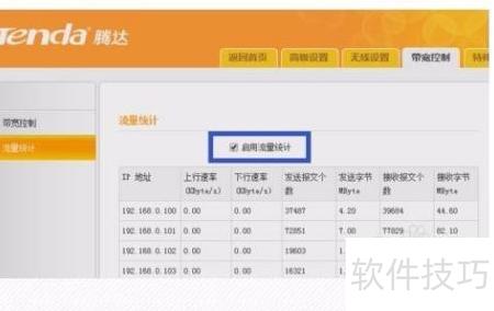3、 在流量统计标签页中,开启启用流量统计功能后,即可查看所有连接该路由器的设备的流量使用详情。