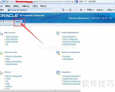 1、 以管理员身份登录BI Publisher服务器后,进入管理页面并选择相应的配置选项进行操作。