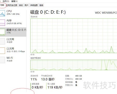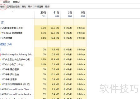 3、 打开任务管理器,点击性能选项卡查看系统状态。