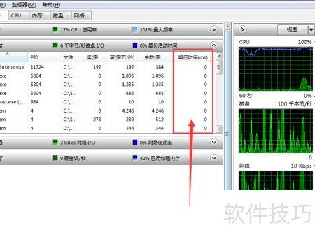 5、 点击磁盘选项,最后一列显示响应时间数据。