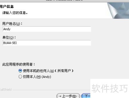 4、 在图2.4中,用户需输入用户名与单位名称,选择软件使用权限后,点击下一步继续操作。