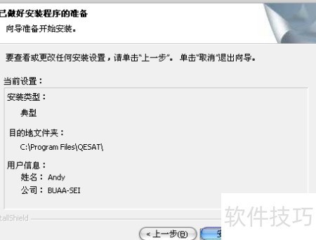 8、 图2.7为安装配置信息汇总,核对无误后点击安装按钮,系统将自动完成QESat在本地计算机上的部署过程。