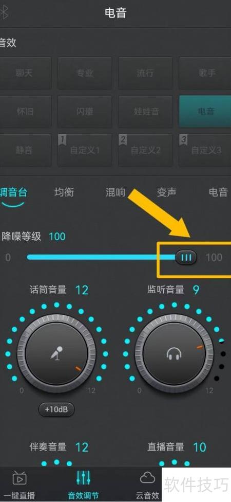 3、 将降噪调节按钮调至,即可启动系统自动屏蔽背景噪音功能。