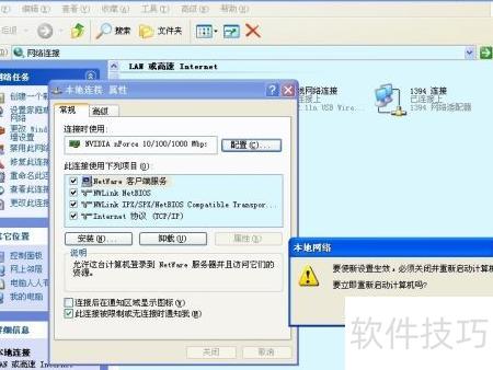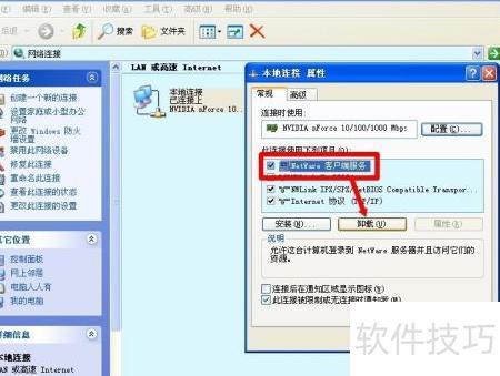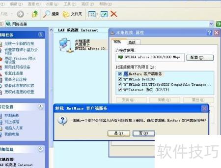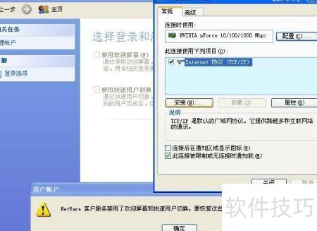 12、 有时尽管本地连接属性中未显示 NetWare 客户服务,但在用户账户界面系统仍提示需卸载该服务,这通常是因安装后未能正常显示所致(属于系统异常)。此时可尝试重新安装 NetWare 客户服务,待其在本地连接中显现后,再通过勾选方式完成卸载操作即可顺利解决。