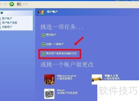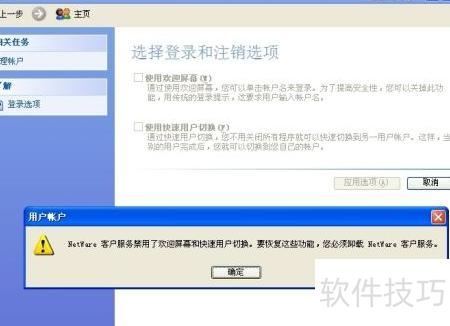 6、 打开控制面板,进入用户账户设置,选择更改登录或注销方式,勾选启用欢迎屏幕并应用。若界面显示为灰色无法操作,并提示NetWare客户服务禁用了欢迎屏幕和快速用户切换,则说明该服务已阻止相关功能。需卸载NetWare客户服务后,方可恢复欢迎屏幕及多用户快速切换功能,否则设置将无法生效。