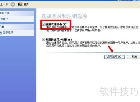 3、 选择登录注销,勾选欢迎屏幕,点击应用确认设置。