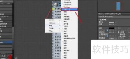 7、 完成材质制作后,选择目标材质并点击选中,在操作界面中选定物体,通过材质编辑器中的赋予工具或将鼠标右键菜单中的选项来完成材质的赋予。
