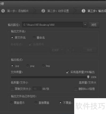 36、 第三步进行与之前相同的系列设置,包括路径、文件名、格式、质量及输出参数,保持与前一致,完成后即可开始批量处理。