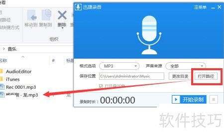 10、 可对不同声音源和格式进行设置,点击打开文件夹按钮,即可查看录音文件的保存路径。