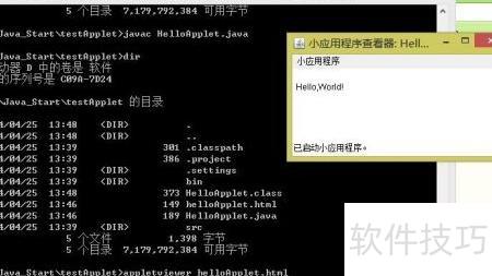 11、 在控制台中编译编写好的HelloApplet类,输入命令javac HelloApplet.java进行编译。编译成功后,在命令行运行appletviewer helloapplet.html命令来启动小程序查看器。程序运行效果将显示在窗口中,具体界面所示,可直观看到输出结果。