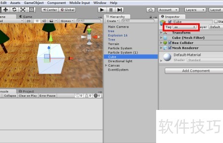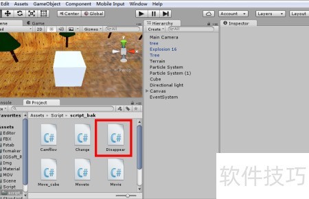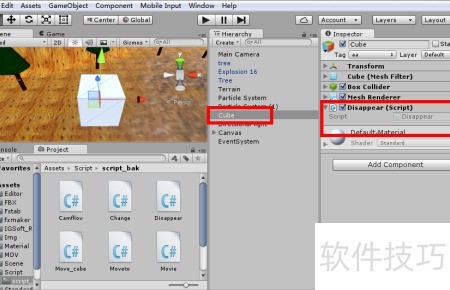 6、 将Disappear脚本拖拽至立方体Cube上即可完成操作。