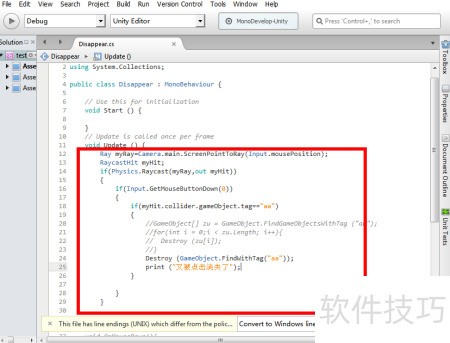 12、 开启Disappear脚本,在Update函数中加入相应代码,可将上方的OnMouseDown部分移除。