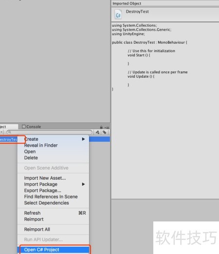 4、 选中DestroyTest脚本,双击或右键选择Open C Project打开,操作所示。