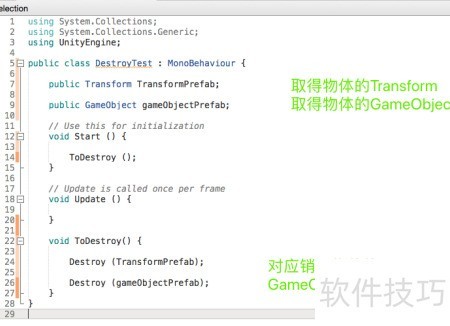 5、 在已打开的脚本中进行代码编写,定义公共变量用于获取Transform和GameObject组件,随后调用Destroy()函数将其逐一销毁,具体实现代码及详细说明所示。