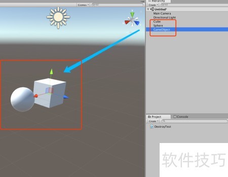8、 运行场景后可见,Sphere已被销毁,而Cube依然存在。这说明当使用Destroy()销毁Transform组件时,物体本身不会被移除;但若直接销毁GameObject,则物体能正常被删除。因此,在调用Destroy()函数时需特别注意销毁对象的类型,以确保预期效果。具体结果所示。