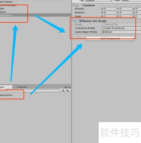 7、 将DestroyTest脚本挂载到GameObject对象上,随后在检视面板中将Cube赋值给脚本的transformPrefab变量,将Sphere赋值给gameObjectPrefab变量,具体设置所示。操作完成后,脚本即可正确引用这两个预制物体并执行相应逻辑。
