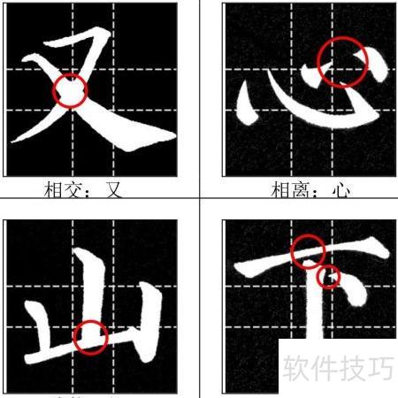 45、 笔画间存在相接、相交与相离三种关系,既关乎运笔技巧,也影响字体结构,是连接笔法与字形的关键。其中虚接技法尤显空灵韵味,属相接中的核心手法,具体可参见下方四字实例。