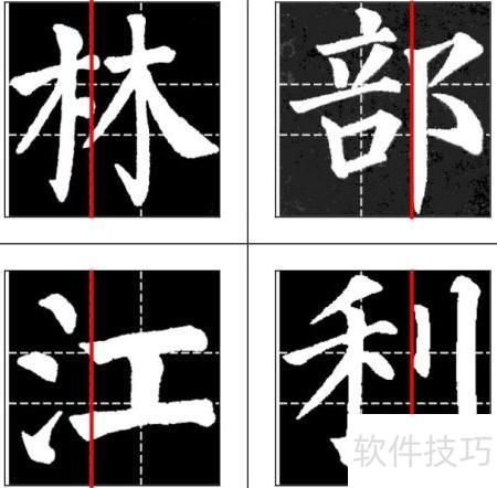 79、 左右结构的汉字在横向布局上主要有三种宽窄关系:左窄右宽、左宽右窄和左右等宽。其中左右等宽较为少见,多数情况下左右部件呈现不等比例,且其宽窄常符合黄金分割比。借助黄金格的左线与右线,可精准把握这种比例关系,如林、江、部、利四字所示,结构分布协调自然。