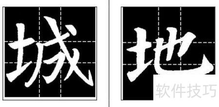 114、 城、地的土作左偏旁时写窄长,去、志的土作字头时写扁宽。