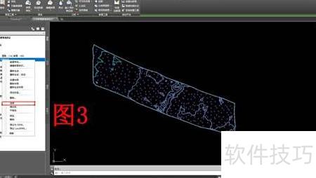 9、 在窗口左侧的图形工具区,点击曲面类别,展开其下的选项。随后,在2所示界面中,找到并选中红色边框标注的地形名称(即所需操作的实体)。右键单击该名称,弹出3所示菜单,选择选择命令,即可成功选定目标地形图用于后续操作。