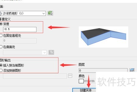 12、 在弹出的界面中,需重点关注深度与图形输出两项设置。参照图示选项进行选择后,点击创建实体,即可完成地形实体的生成。该模型支持导入至Revit软件,用于构建地形实体族,便于后续的建筑信息模型设计与应用。