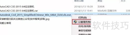 5、 将百度网盘中的AutoCAD Civil 3D 2015安装文件与注册工具下载至本地磁盘,解压后暂停网络连接。随后定位到Autodesk_Civil_2015_SimplifiedChinese_Win_64bit_DLM.sfx.exe安装程序,右键点击该文件,选择以管理员身份运行启动安装流程。此操作可确保安装过程稳定,并为后续激活步骤做好准备。注意在整个安装过程中保持断网状态,避免程序联网校验导致安装失败或激活异常。