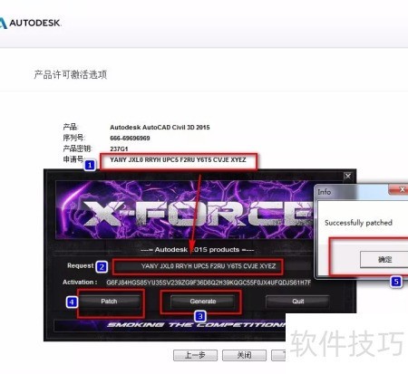 20、 此步骤极为关键,务必依照图示准确操作。首先,将安装界面申请码区域的内容通过快捷键Ctrl+C复制,再使用Ctrl+V粘贴至注册机Request栏后的输入框中。随后点击按钮,系统将自动生成对应的激活码。请注意,整个过程中复制与粘贴必须使用快捷键完成。接着,点击注册机界面上的按钮,当弹出Successfully Patched提示窗口时,点击完成操作,确保每一步都准确无误。