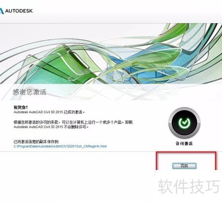 22、 提示AutoCAD Civil 3D 2015已成功激活,先点击退出注册机程序,随后点击按钮,软件将自动启动并进入主界面。