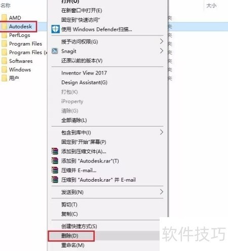 24、 打开C盘,定位到Autodesk文件夹,右键点击并选择删除,清除多余的安装文件。