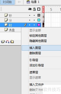5、 在时间轴添加三个图层,依次将图层X双击重命名为时、分、秒。