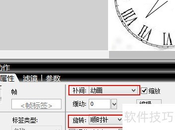8、 依次选择秒分时元件,在属性面板中将补间设为动画,旋转方向选顺时针,并按实际走速设定各自的旋转次数。