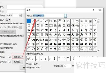 6、 点击标记后的修改按钮,打开符号对话框,选择Wingdings 2字体,找到带勾的方框符号,确认即可完成设置。